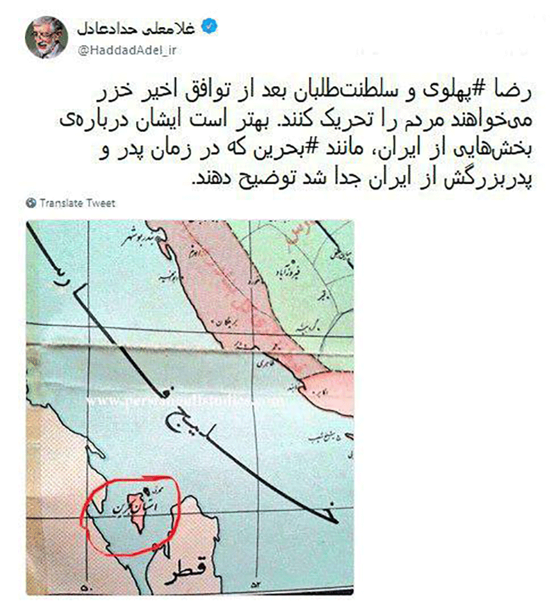 غلامعلی حدادعادل؛ عضو مجمع تشخیص مصلحت نظام و رئیس مجلس هفتم در صفحه توئیترش به اظهارات رضا پهلوی فرزند محمدرضا پهلوی واکنش نشان داد و خطاب به او مثال استان بحرین ایران را زد.