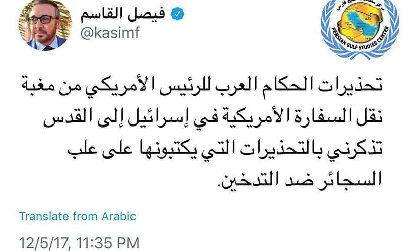 فیصل قاسم نوشت: هشدارهای رهبران عرب به ترامپ پیرامون انتقال سفارت به قدس مرا یاد هشدارهای روی پاکت سیگار میاندازد.