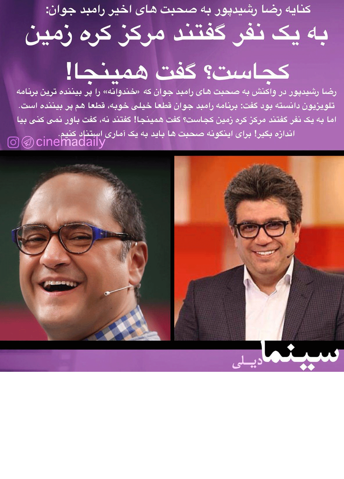 واکنش رضارشیدپور به صحبت های رامبد جوان درباره اینکه «خندوانه» پربیننده ترین برنامه تلویزیون است: به یک نفر گفتند مرکز زمین کجاست؟گفت همینجا