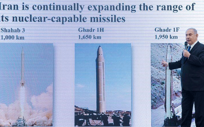 تصویری که نتانیاهو نمایش می دهد، در واقع سه فروند موشک قدر اف، قیام و شهاب ۳ است و بالای هر موشک به طور جداگانه نام و برد آن موشک نوشته شده است.