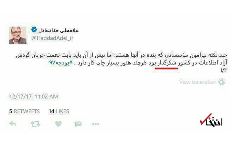 غلامعلی حدادعادل، رییس فرهنگستان زبان و ادب فارسی در توئیت اخیر خود در توجیه بودجه اختصاص یافته به موسسه زیرمجموعه اش، املای کلمه «شکرگزار» را اشتباه نوشت.