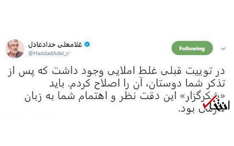 حداد عادل پس از اشتباه نوشتن کلمه “شکرگزار” از دقت نظر کاربران فضای مجازی تشکرد و آن را اصلاح کرد:
