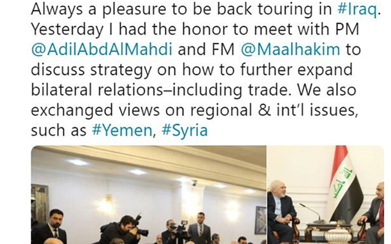 وی در نخستین توئیت نوشت: «گردش در عراق همیشه خوشایند است. دیروز افتخار دیدار با نخستوزیر عادل عبدالمهدی و وزیر خارجه محمد علی الحکیم برای بحث درباره نحوه توسعه بیشتر روابط دوجانبه از جمله تجارت را داشتم. درباره مسائل منطقهای و بینالمللی از جمله یمن و سوریه هم تبادل نظر کردیم.»