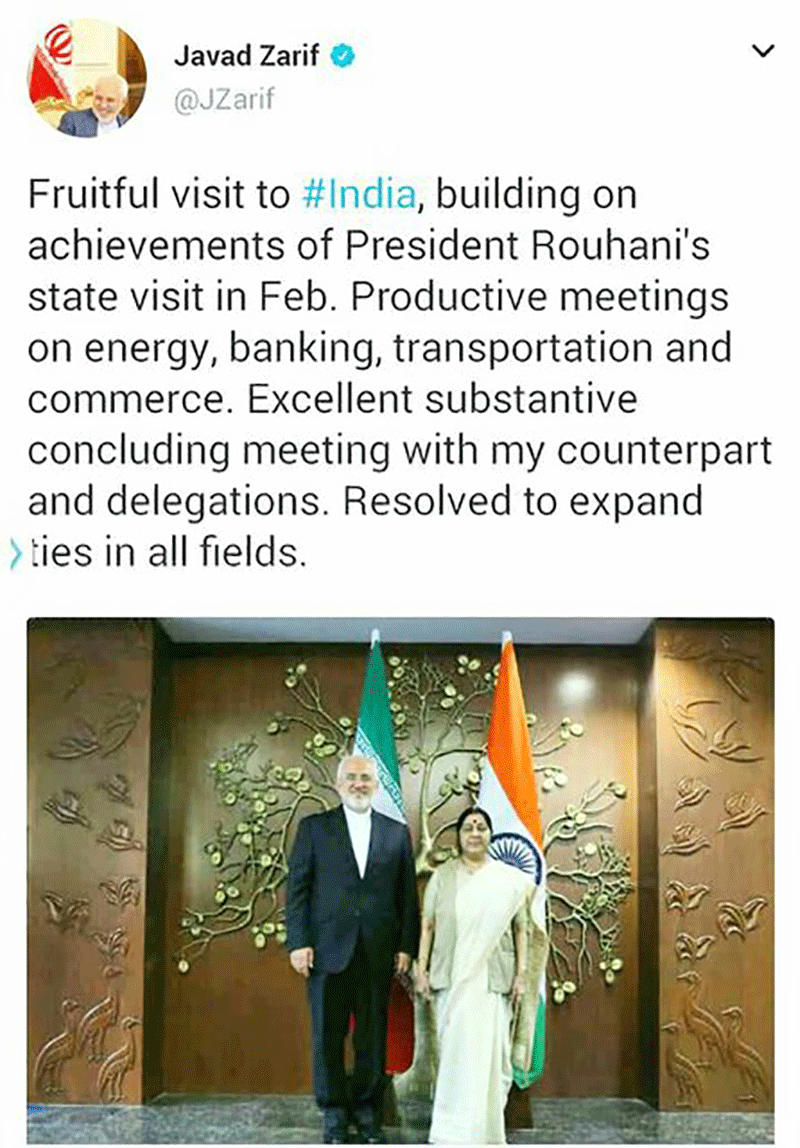 وزیر امور خارجه کشورمان در توییتر خود نوشت: بر پایه دستاوردهای سفر رسمی رئیسجمهور به هند در فوریه، سفری مفید به این کشور داشتم. جلسات پرباری در حوزههای انرژی، بانکداری، حمل و نقل و تجارت انجام شد.