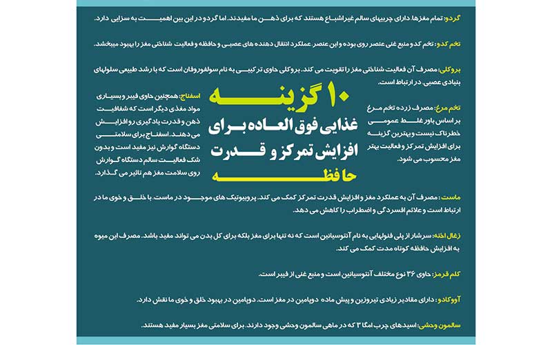 اگر رژیم غذایی خود را صحیح و براساس غذاهایی انتخاب کنید که هوش را تقویت می کنند، می توانید حتی در سنین بالاتر نیز از سلامت مغزی مطلوبی بهرهمند باشید. با این حال، عدم مصرف کافی ۱۰ گزینه غذایی، ممکن است حتی در سنین پایین منجر به کاهش تمرکز در شما شود.