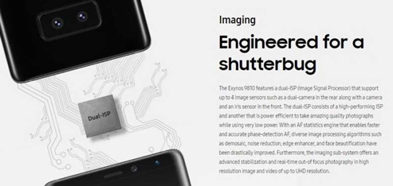 تراشه اکسینوس ۹۸۱۰ که قلب تپندهی برخی از مدلهای گلکسی اس ۹ و گلکسی اس ۹ پلاس خواهد بود، پیشرفتهایی در زمینه پردازش تصاویر دارد. این پردازنده مجهز به پردازشگر سیگنال تصویر دوگانه (Dual ISP) است که از چهار سنسور پشتیبانی میکند؛ به همین جهت، سامسونگ خواهد توانست پرچمدار جدیدش را با دوربین دوگانه در پشت و در جلو ارائه دهد. در جلوی گوشی، شرکت کُرهای میتواند از یک سنسور برای دوربین سلفی و یک سنسور دیگر برای اسکنر عنبیه استفاده کند. همچنین وعده داده شده است که کیفیت تصاویر دستخوش بهبود خواهد شد و گوشی عملکرد بهتری در هنگام فوکوس خودکار خواهد داشت.