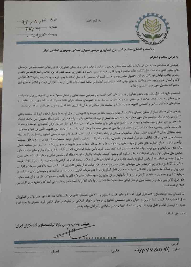 علیقلی ایمانی، رئیس ستاد توانمندسازی گندمکاران ایران بهنمایندگی از یک میلیون و سیصد هزار گندمکار با ارسال نامهای به ریاست و اعضای کمیسیون کشاورزی مجلس شورای اسلامی جمهوری اسلامی ایران نوشت: