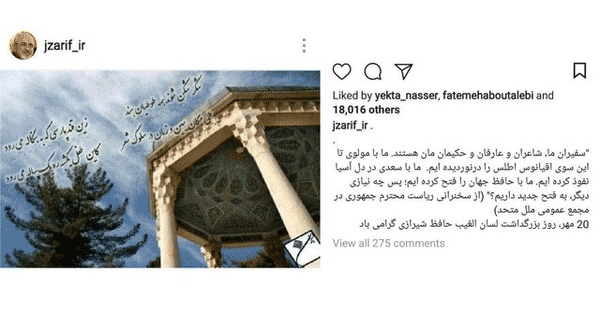 به گزارش ایلنا، وزیر امور خارجه کشورمان، صبح روز پنجشنبه با انتشار بخشی از صحبتهای حسن روحانی در مجمع عمومی سازمان ملل در مورد شعرای برجسته ایرانی ازجمله مولوی، سعدی و حافظ، روز حافظ را گرامی داشت.