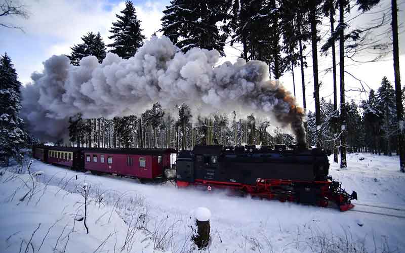 یک لوکوموتیو بخار در حال حرکت در خط آهن «هارز نارو گاوگ» در آلمان