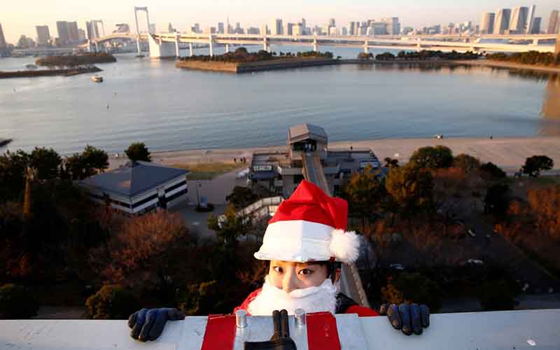 یک شیشه پاککن در توکیو، به مناسب فرا رسیدن سال نوی میلادی، لباس بابانوئل به تن کرده است