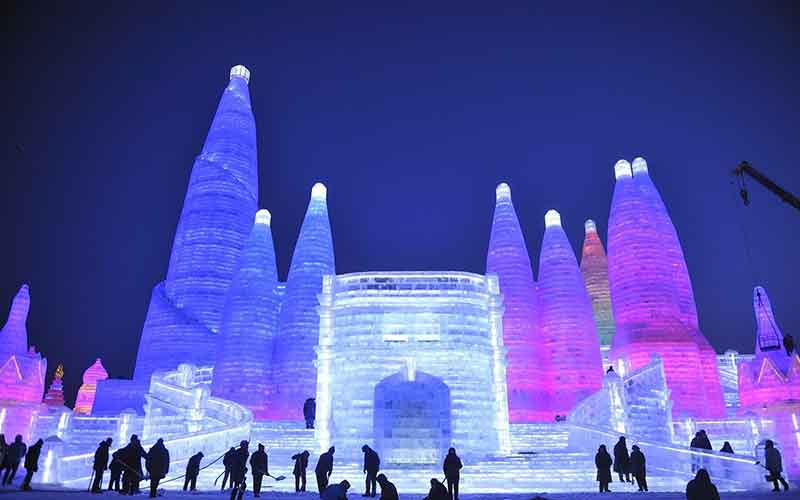 کارگران در حال انجام عملیات تعمیر و نگهداری مجسمهها و عمارتهای یخی پارک یخ و برف در هاربن چین