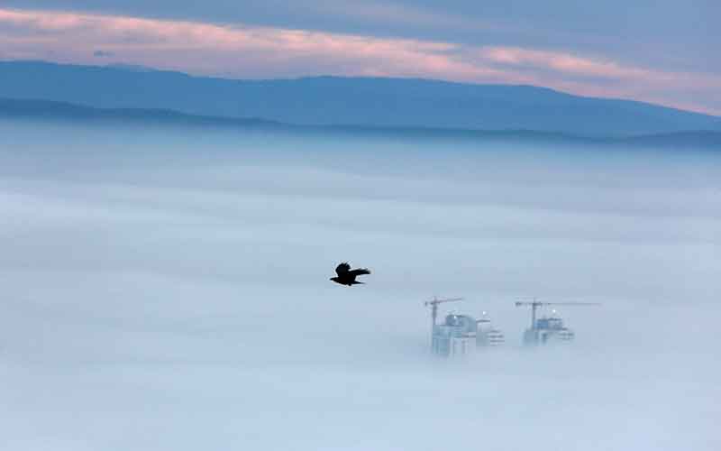 پرواز یک پرونده بر فراز شهر اسکوپیه، پایتخت مقدونیه که زیر لایهای ضخیم از ابر و مه پنهان شده است