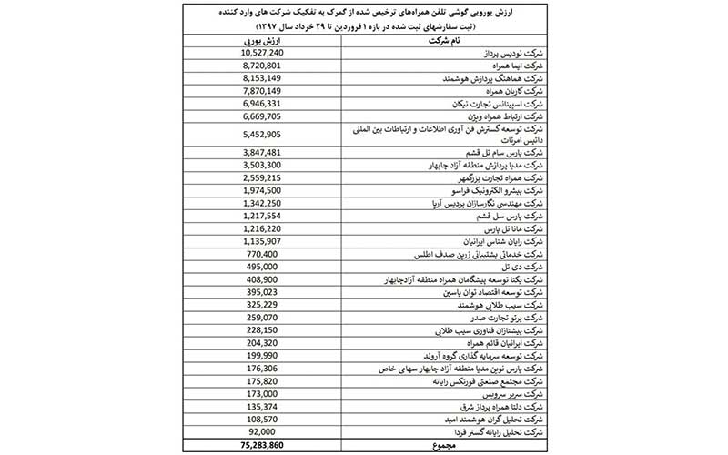 وزارت ارتباطات دو روز قبل لیست ۴۰ شرکتی که از دلار ۴۲۰۰ تومانی برای واردات موبایل بهره مند شده بودند را منتشر کرد. بر اساس این لیست به ۴۰ شرکت زیر مبلغی در حدود ۲۲۰ میلیون دلار تخصیص داده شده در حالی که تا زمان انتشار گزارش مذکور، تنها ۷۵ میلیون دلار موبایل توسط (تعدادی از) این شرکتها از گمرکات مختلف، کشور وارد شده است.