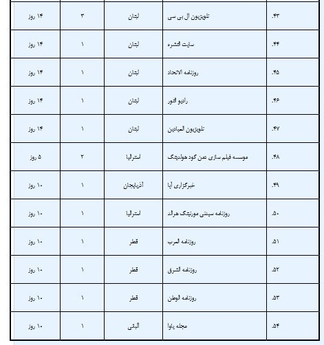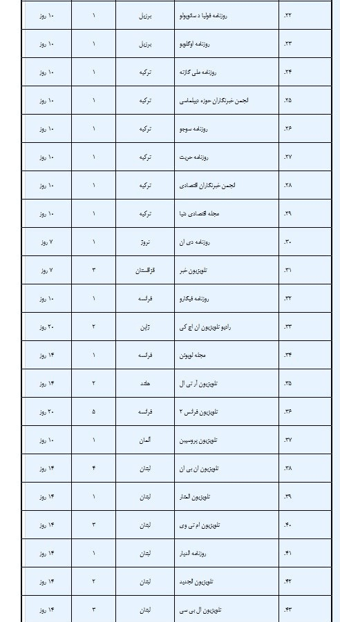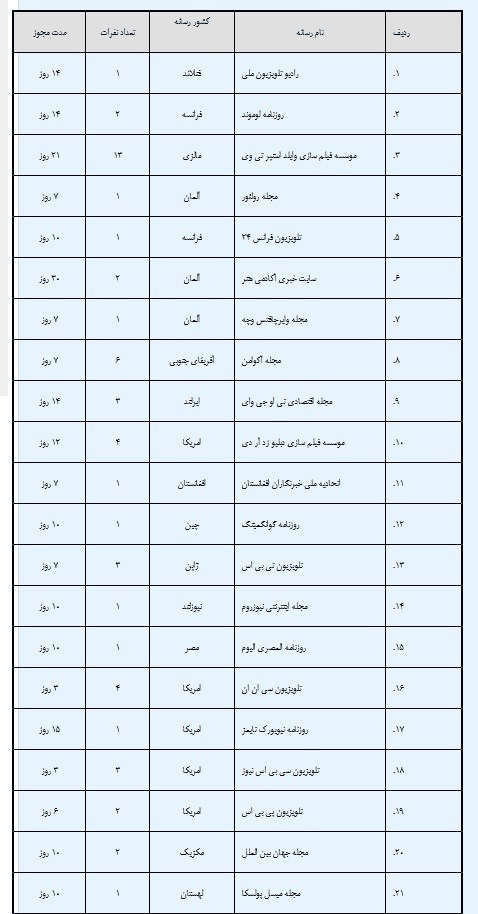 فهرست مجوزهای «روادید مطبوعاتی زمان‌دار» برای خبرنگاران «غیرمقیم» رسانه‌های خارجی که در مهر ماه امسال به ایران آمدند، منتشر شد.