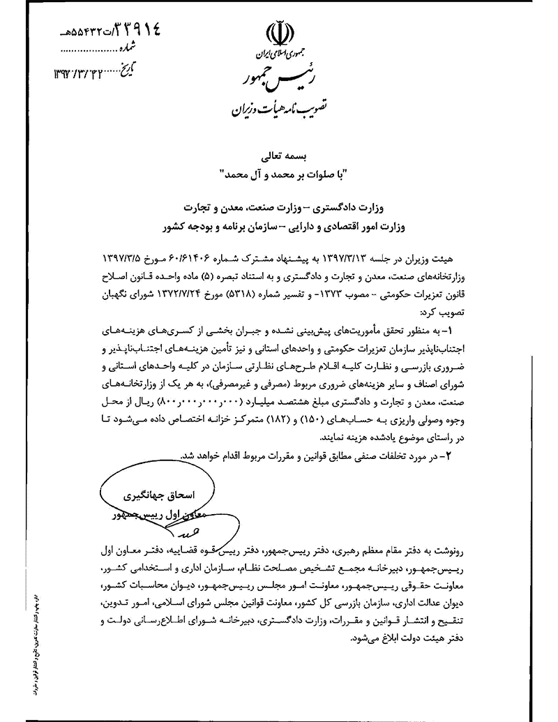 هیأت وزیران در جلسه ۱۳۹۷/۳/۱۳ به پیشنهاد مشترک شماره ۶۰/۶۱۴۰۶ مورخ ۱۳۹۷/۳/۵ وزارتخانههای صنعت، معدن و تجارت و دادگستری و به استناد تبصره ۵ ماده واحده قانون اصلاح قانون تعزیرات حکومتی مصوب ۱۳۷۳ و تفسیر شماره ۵۳۱۸ مورخ ۱۳۷۲/۷/۲۴ شورای نگهبان تصویب کرد: