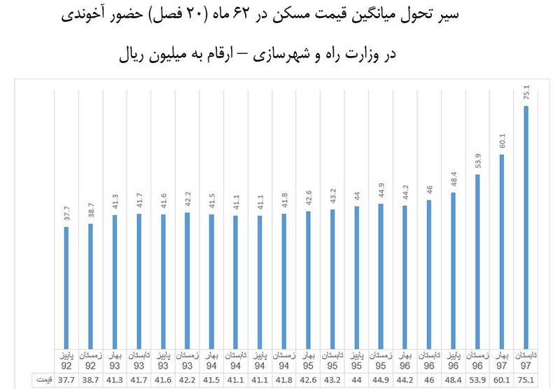 آخوندی به بهانه وجود ۲.۵ میلیون واحد مسکونی خالی، حاضر به اجرای سیاست حمایت از تولید مسکن نشد و نهایتا همین کمبود مسکن مصرفی دامن بازار و مصرف کنندگان و خریداران واقعی را گرفت و به گرانی ۸۳ درصدی مسکن در مهر ماه امسال نسبت به مهر ماه سال گذشته منجر شد. به گونه ای که میانگین قیمت هر مترمربع آپارتمان از ۴.۷ میلیون تومان در مهر ۹۶ به ۸.۶ میلیون تومان در مهر ۹۷ رسیدیم. اگرچه برخی کارشناسان گرانی مسکن را به عواملی همچون نوسانات بازارهای موازی مسکن در ماه های گذشته یا نقدینگی مهارنشده مرتبط می دانند اما بسیاری از کارشناسان علت آن را توقف طولانی مدت ساخت و ساز و کمبود واحد مسکونی نوساز و مصرفی عنوان می کنند.